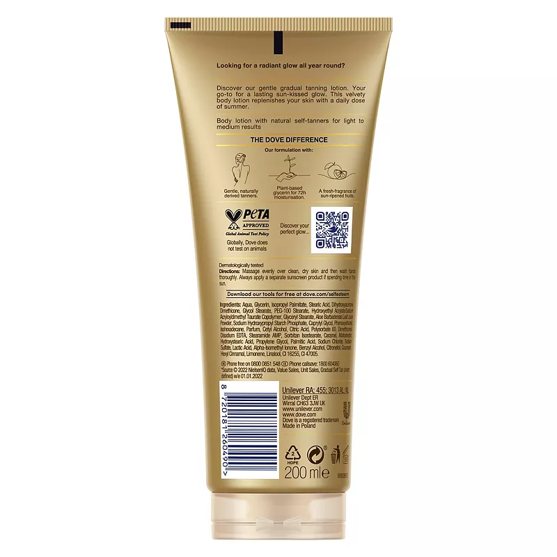 Dove has combined dermatological care with beauty expertise to develop Cell-Moisturisers: key moisturising actives compressed from natural seed oils. By combining this technology with natural-looking tanners for the first time, Dove created a pampering lotion that gradually builds a sun-kissed look while providing 72h of active moisturisation. Quickly absorbed, this gradual tanning lotion hydrates deep* down and leaves skin feeling soft and hydrated.